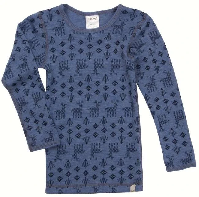 Celavi Mädchen Langarmshirt aus Merino Schurwolle in blau melange mit Elch