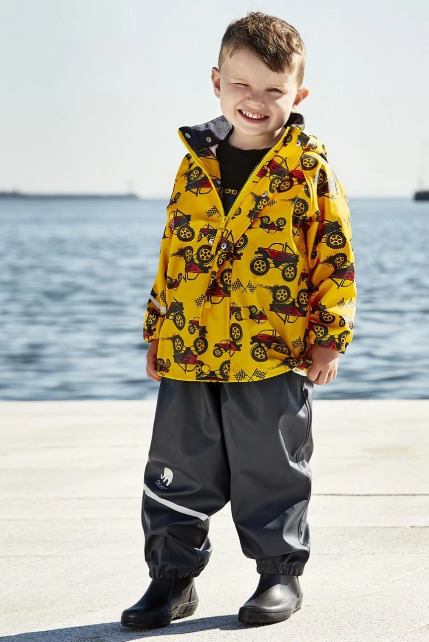 CeLaVi Regenoutfit Zweiteiler gelb schwarz mit coolen Truck-Cars