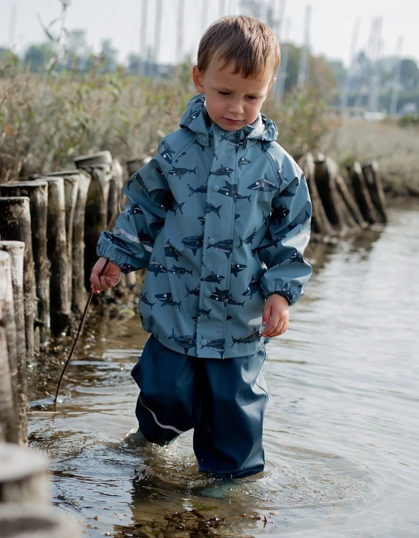 Wasserdichtes Celavi Regenoutfit für Kinder. Das coole Haifisch Motiv gefällt sicher allen kleinen Pfützenspringern. Da kann es Bindfäden regnen – im Celavi Regenanzug können die Kleinen unbeschwert draußen toben und spielen. Das Set besteht aus Regenjacke und dazu passender Regenhose. Ideal für den Kindergarten und Spielplatz. Wasserdicht, bequem geschnitten und klein zusammenlegbar.