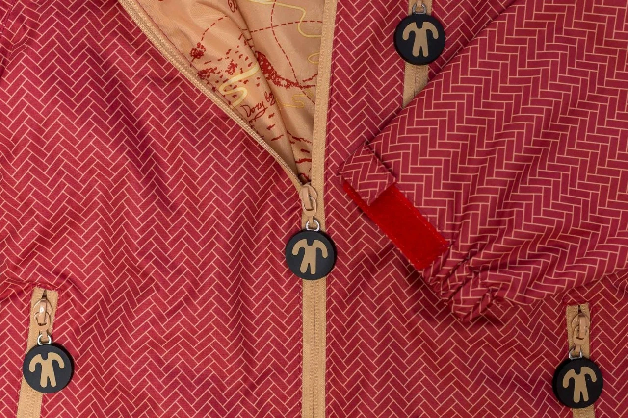Praktischer wasserdichter Matschoverall von Ducksday. Der Regenanzug Wick hat ein schönes grafisches Muster in ziegelrot. Der ideale Regenoverall zum Drüberziehen als Schmutz und Nässeschutz für den Spielplatz, Sandkasten, Kindergarten oder zum Fahrradfahren.