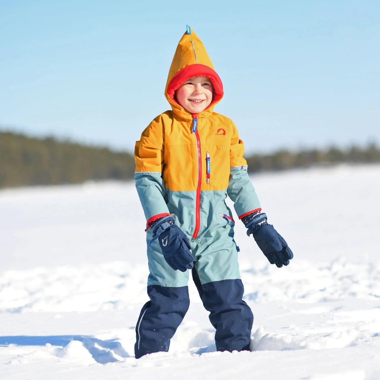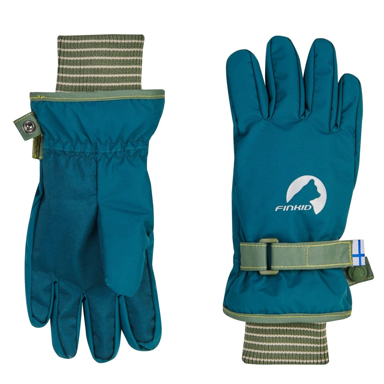 Kuschelwarme gefütterte Kinder Handschuhe aus hochwertigem Funktionsgewebe. Die schönen Finkid Fingerhandschuhe Pikkurilli haben ein wärmendes Fleecefutter und ein elastisches Bündchen am Handgelenk. Das wasserdichte Funktionsgewebe ist robust und hält Kälte, Nässe und Schmutz ab. Am Handgelrnk ist die Weite mittels Klettriegel veränderbar. Die einzelnen Handschuhe können durch einen Druckknopf zusammen geknöpft werden. Das Außenmaterial ist strapazierfähig und trotzdem weich und angenehm im Griff. Ideal für alle Outdoor-Aktivitäten bei Schnee und Eis.