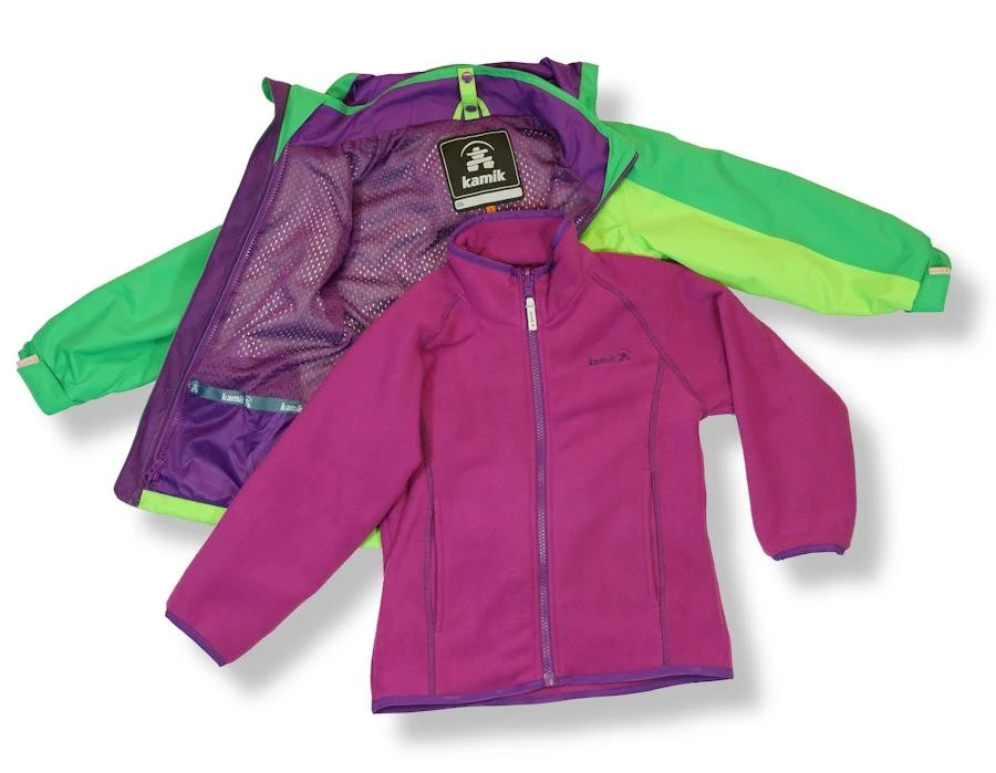 Robuste und wasserdichte 3 – in 1 Multifunktions-Outdoorjacke von Kamik. Bequem geschnitten, winddicht und atmungsaktiv. Hochwertige Verarbeitung mit vielen modischen Details. Die praktische System Doppeljacke ist variabel nutzbar. Die Außenjacke ist eine wasserdichte atmungsaktive Regenjacke. Innen eingezippt ist eine warme kuschelige Fleecejacke. Beide Jacken kann man auch einzeln tragen als Übergangsjacke oder Regenjacke. Die Fleecejacke in der Farbe purple ist hochwertig verarbeitet und sieht richtig gut aus.