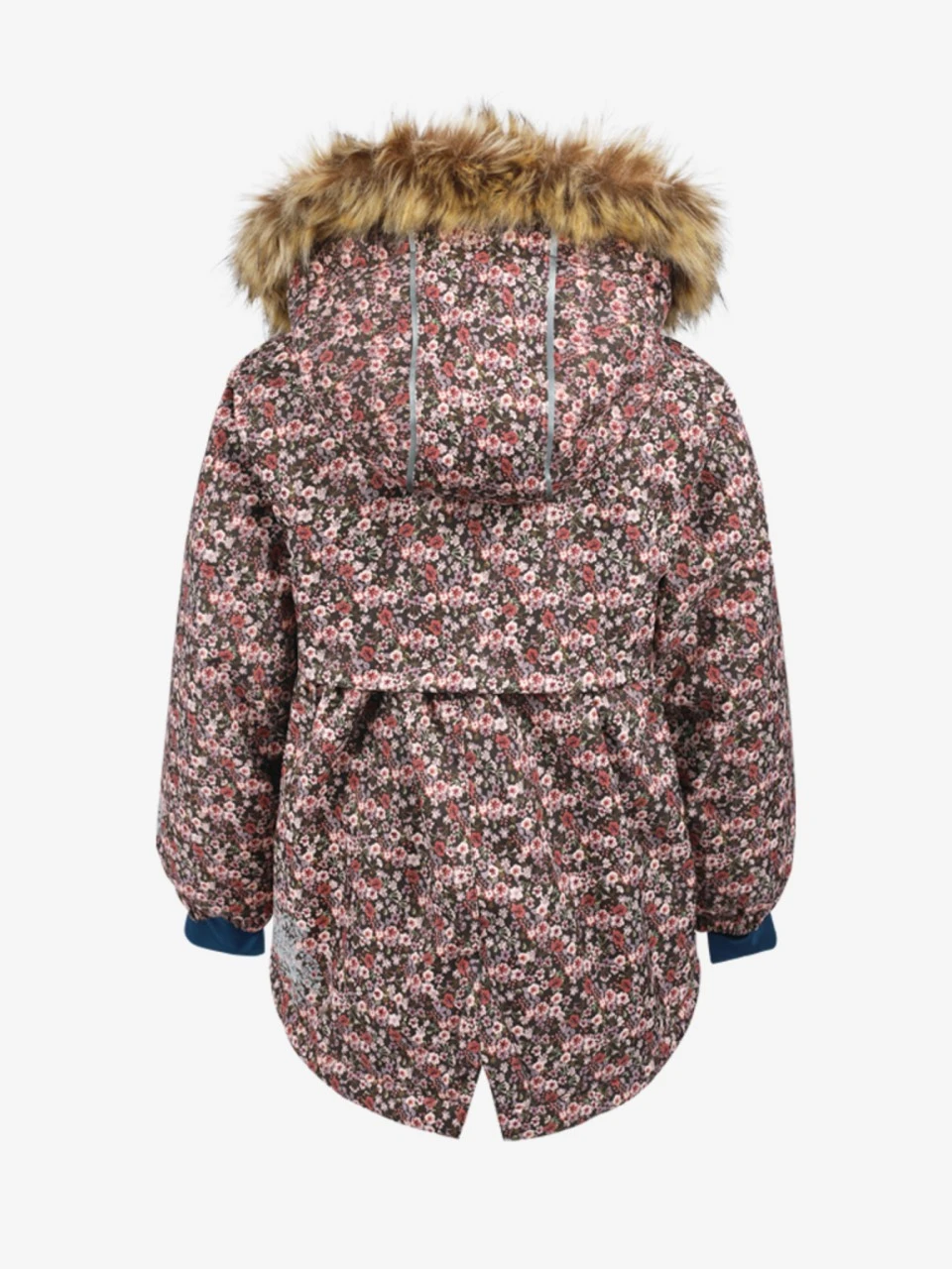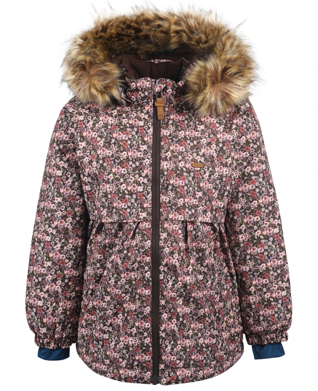 Zauberhafte Mädchen Funktions Outdoorjacke mit Blümchen. Die hübsche Mädchenjacke ist geeignet für alle Wetterlagen und Temperaturen in der kühleren Jahreszeit. Die schöne warme Kapuze hat einen abknöpfbaren Kunstpelzbesatz. Markenware von Minymo – der hochwertigen Trendmarke aus Dänemark.